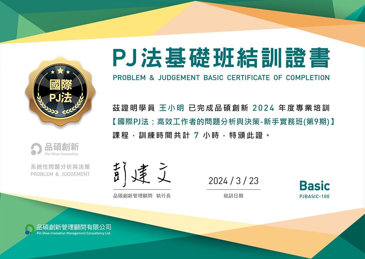 完成 10 小時課程,將能獲得《國際PJ法™》基礎班結訓證書 1 張(實體證書),能證明學員接受「問題分析與解決」能力的課程培訓。