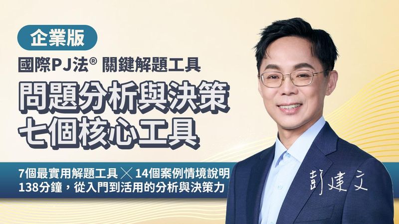 本課程由彭建文老師從《國際PJ法®》完整方法論中,萃取七個最關鍵的實戰工具,專為企業基層人才與團隊成員打造的問題解決入門課程。