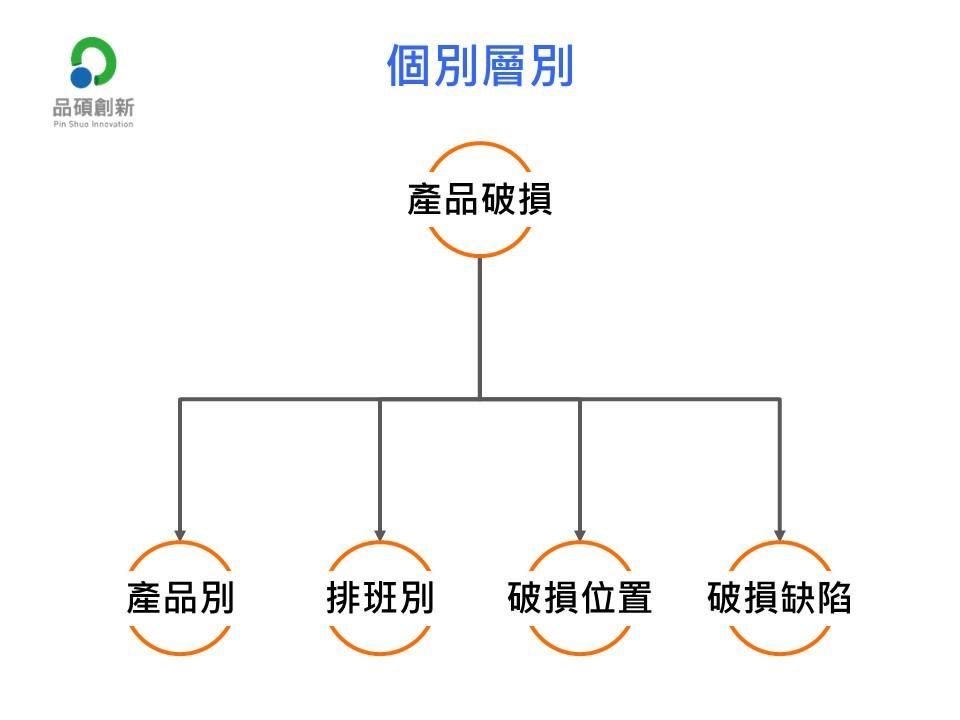回到產品破損高的問題。假設,產品破損的瓶子數量總共有100瓶,我們想了4個類別來做分類。此種分析稱為「個別層別」,也就是針對一群資料做單獨層別。