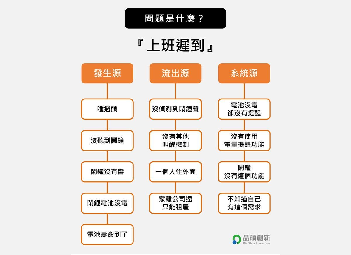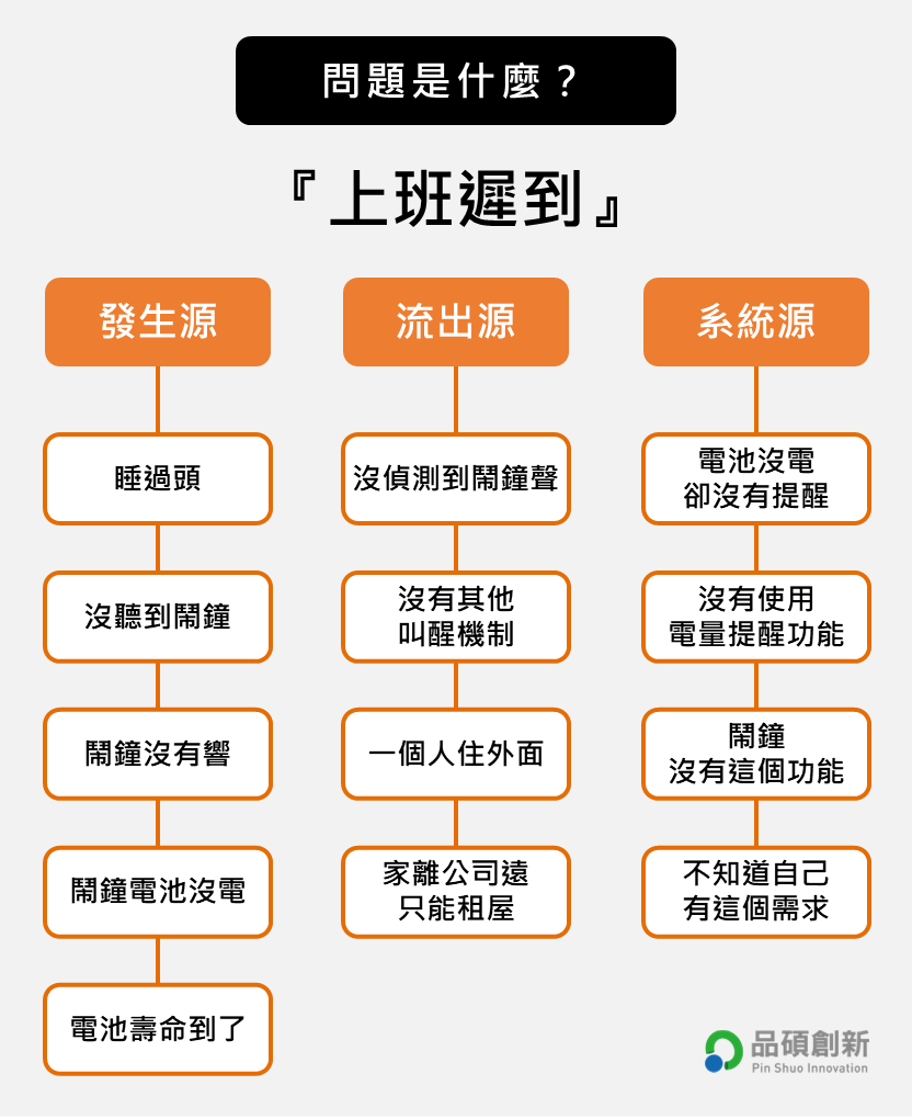 假設按照過去的解決問題方法,你可能只會把鬧鐘的電池換掉,然後認為問題已經解決了。但很不幸的是,因為電池會有壽命,所以過一段時間後,又會因為電池沒電而睡過頭。