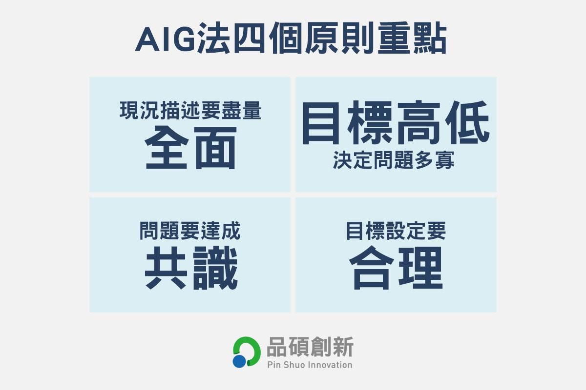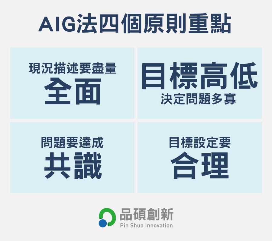 如同上面的例子,未來如果你們在工作上常常聽到,像是:能力不足、開會沒有效率等等,記住一定要讓它有「量化的數字」,然後用「AIG法」來看出他有沒有落差。因為「AIG法」的精神是「量化的數字」,有四個原則重點,如下圖: